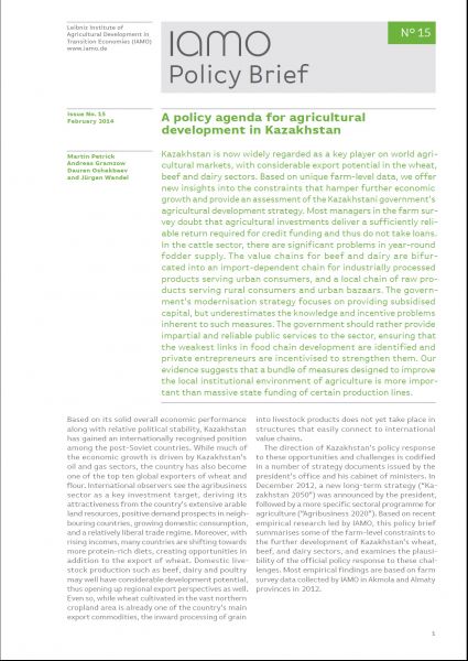 This policy brief presents major results of the empirical studies carried out by IAMO on analyzing constraints that hamper further economic growth and export potentials in the wheat, beef and dairy sectors and provides an overall assessment of the Kazakhstani government’s agricultural development strategy.