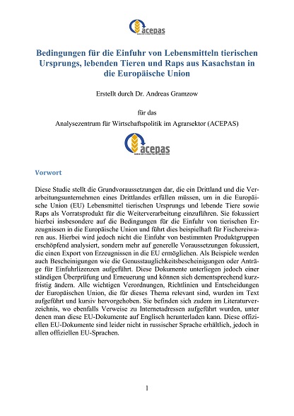 Diese Studie beschreibt die Grundvoraussetzungen, die ein Drittland und Verarbeitungsunternehmen eines Drittlandes erfüllen müssen, um in die Europäische Union Lebensmittel tierischen Ursprungs und lebende Tiere sowie Raps als Vorratsprodukt für die Weiterverarbeitung einzuführen. Sie fokussiert insbesondere auf die Bedingungen für die Einfuhr von tierischen Erzeugnissen und führt dies beispielhaft für Fischereiwaren aus. Dabei wird jedoch nicht die Einfuhr von bestimmten Produktgruppen erschöpfend analysiert, sondern mehr auf generelle Voraussetzungen fokussiert, die einen Export von Erzeugnissen in die EU ermöglichen.